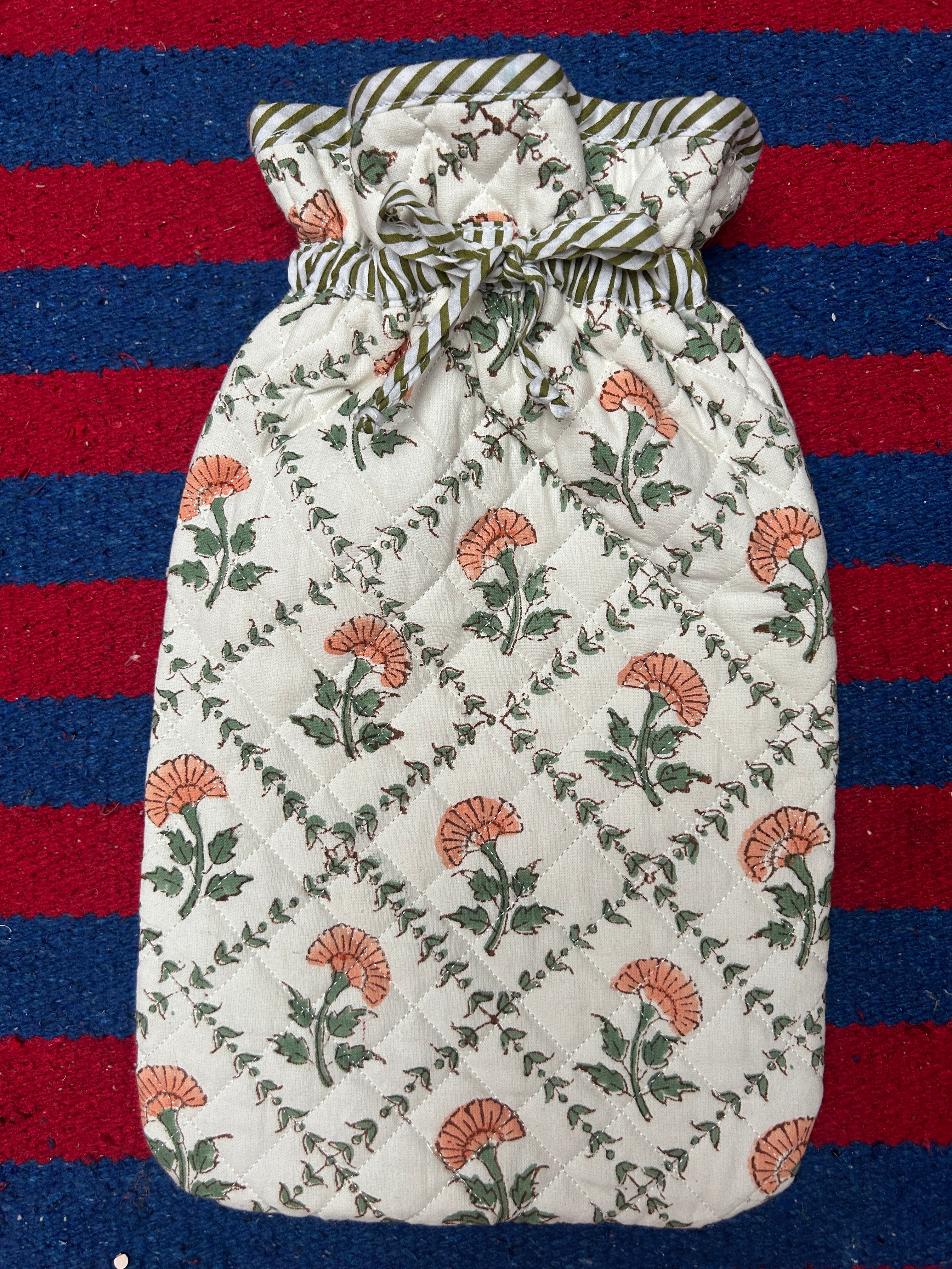 Hot water bottles have been keeping us nice and warm as early as the 1500's! We are excited to share our variety of colourful, quilted and hand block printed covers which will make the bottle look pretty inside your snuggly bed. These are reversible, have a contrasting trim and all come with a cotton drawstring.