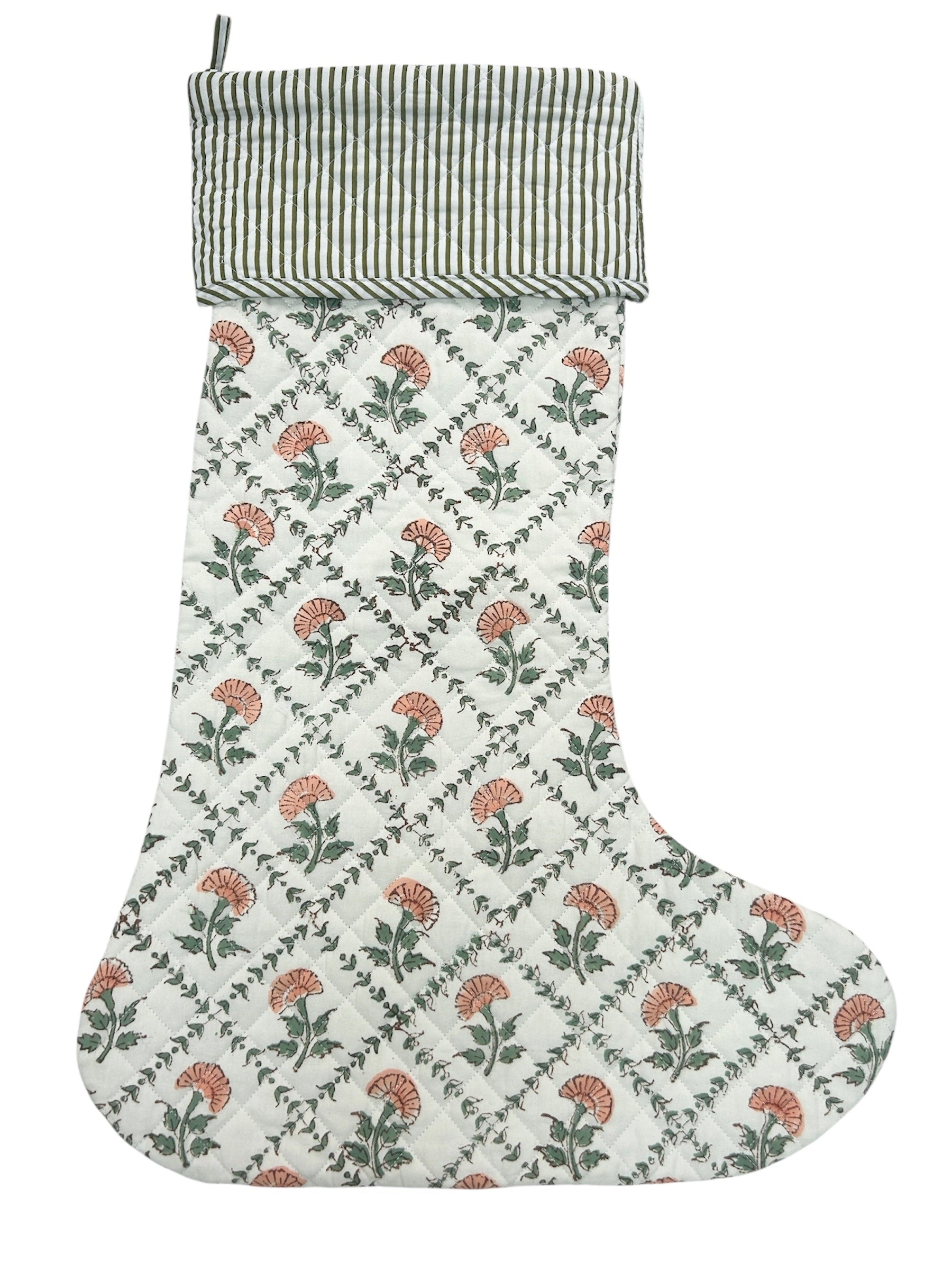 Our quilted stockings are exclusively hand block printed in Jaipur onto the cambric cotton by a small team of printers and stitched by tailors. This motif is contrasted by the stripes which look rather nice along the cuff. The stockings are lightly quilted and have a little string for hanging.